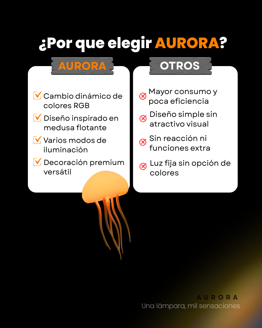 es una experiencia visual y sensorial que transforma cualquier espacio. Mientras otras luces se limitan a iluminar, Aurora combina tecnología RGB dinámica, diseño artístico inspirado en la naturaleza y versatilidad total. El resultado es una pieza decorativa inteligente que convierte cada rincón en un ambiente único, relajante y lleno de estilo.”